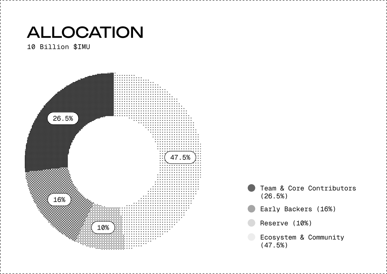 Foresight News 消息,加密漏洞赏金平台 Immunefi 公布 IMU 代币经济学。IMU 代币初始供应量为 100 亿枚,其中 47.5% 将分配给生态系统与社区(上市前销售、用户激励、合作伙伴关系、空投、营销及流动性支持)、16% 将分配给早期支持者、26.5% 将分配给团队与核心贡献者、10% 将用于储备。