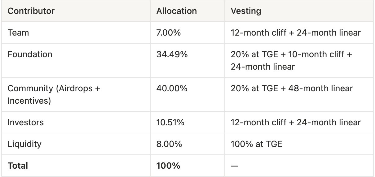 Foresight News 消息,加密 AI Agent 协议 HeyElsa 公布 ELSA 代币经济学,代币总供应量为 10 亿枚,其中团队占比 7%,基金会占比 34.49%,社区(空投 + 激励)占比 40%,投资者占比 10.51%,流动性占比 8%。社区总分配的 40% 中,20%(即总发行量的 8%)会在 TGE 上解锁。剩余部分将在 48 个月内线性解锁。