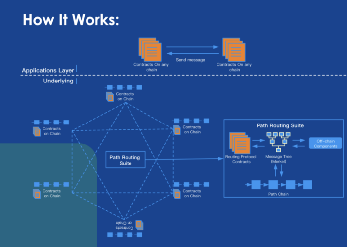 MetaPath 使智能合约能够通过 MetaPath 的路由协议及其元宇宙云相互通信,无论它们位于哪个区块链上。MetaPath 使用默克尔树系统在不同链之间传递消息,同时确保它们的有效性和完整性。