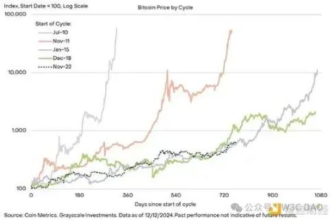 在 2021 年 11 月达到峰值后,比特币的价格在 2022 年 11 月跌至约 16,000 美元的周期性低点。当前的价格上涨期从那时开始,因此持续了两年多。如图 2 所示,最新价格上涨与过去两个比特币周期相对接近,这两个周期在价格达到峰值之前都持续了大约一年。