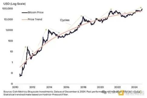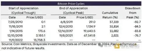 从历史上看,加密货币估值遵循明显的四年周期,价格经历了连续的升值和贬值时期。Grayscale Research 认为,投资者可以监控各种基于区块链的指标和其他措施,以跟踪加密货币周期并为他们的风险管理决策提供信息。