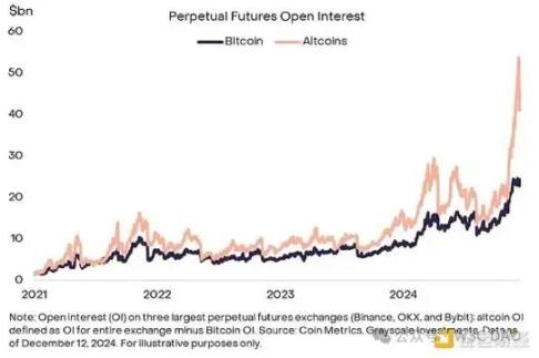 相比之下,山寨币的永续期货未平仓合约 (OI) 已达到相对较高的水平。在 12 月 9 日星期一发生重大清算事件之前,三大永续期货交易所的山寨币未平仓合约已达到近 540 亿美元(图表 9)。