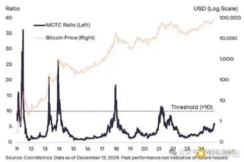 其他周期性指标则侧重于比特币矿工,即保护比特币网络的专业服务提供商。例如,一种常见的衡量标准是计算矿工上限 (MC)(矿工持有的所有比特币的美元价值)与所谓的「热上限」(TC)(通过区块奖励和交易费向矿工发放的比特币的累计价值)的比率。