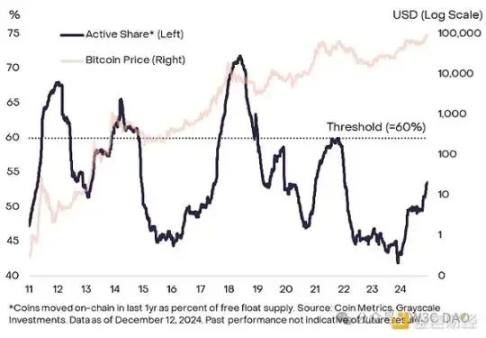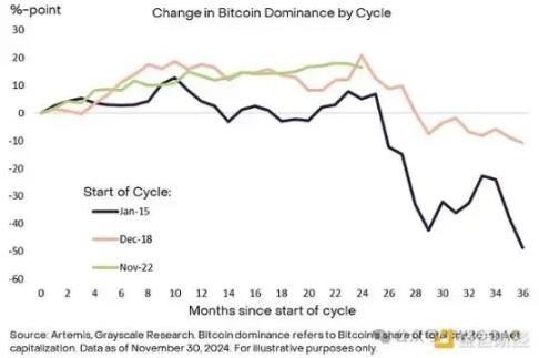 话虽如此,Grayscale Research 认为当前的指标组合与周期的中间阶段一致。只要该资产类别仍然受到基本面(如应用采用和更广泛的宏观市场条件)的支持,牛市就有可能延续到 2025 年及以后。