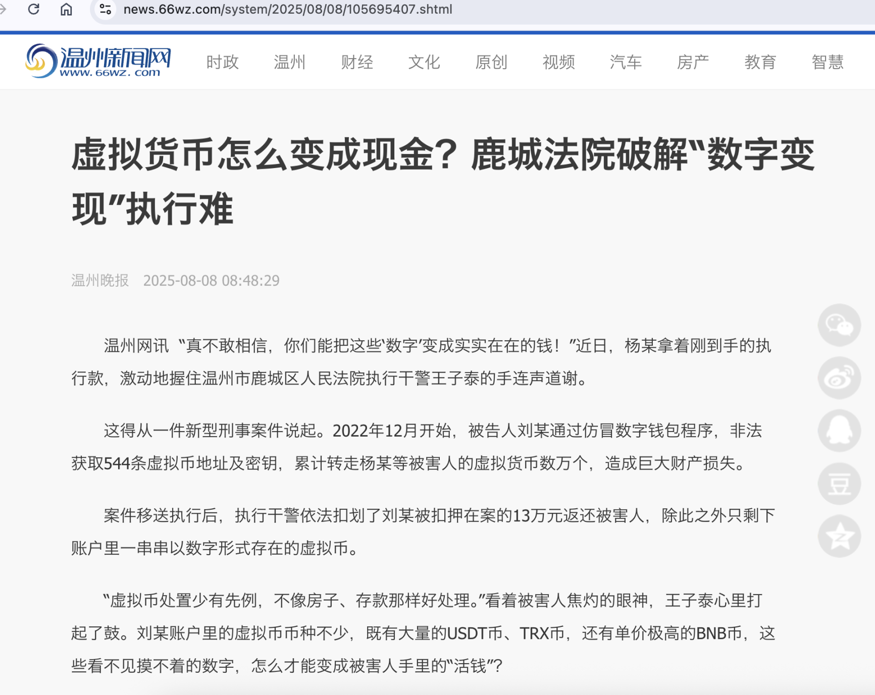 在 8 月 8 日的时候,温州新闻网上发布了一篇《虚拟货币怎么变成现金?鹿城法院破解“数字变现”执行难》的文章,介绍了温州市鹿城区法院对涉案虚拟货币处置变现采用的一种模式。本文作者将其称作“温州模式”。