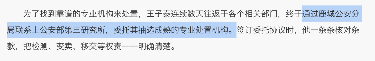 新闻报道中还提到三所抽选出处置公司后,委托机关和处置公司还签订了委托协议,并没有说明是法院还是公安和处置公司签订的委托协议,我个人的判断是公安签订的,因为最终的处置款是先转入了公安账户,再由公安账户转入法院账户。逻辑上说应该是处置公司与公安签订了合同后,才会把处置款转入公安的账户。