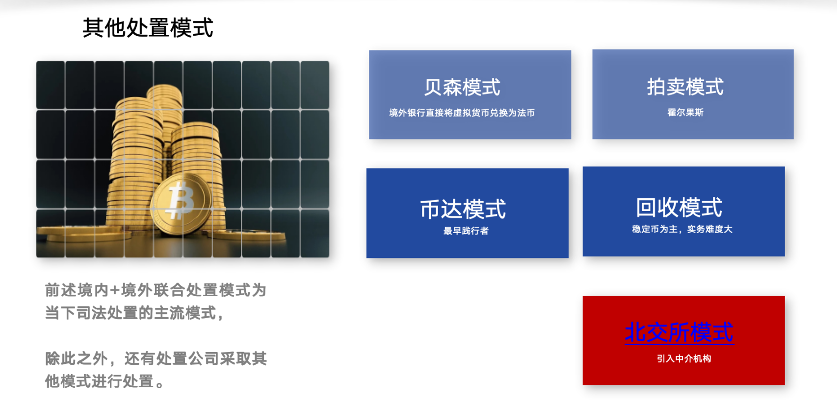 目前国内除了境内 + 境外的联合处置模式外,其实还有下图中的多种模式并行。甚至现在还有一些地方仍然采取最为原始的内地 OTC 向公安机关买币进行处置的业务。