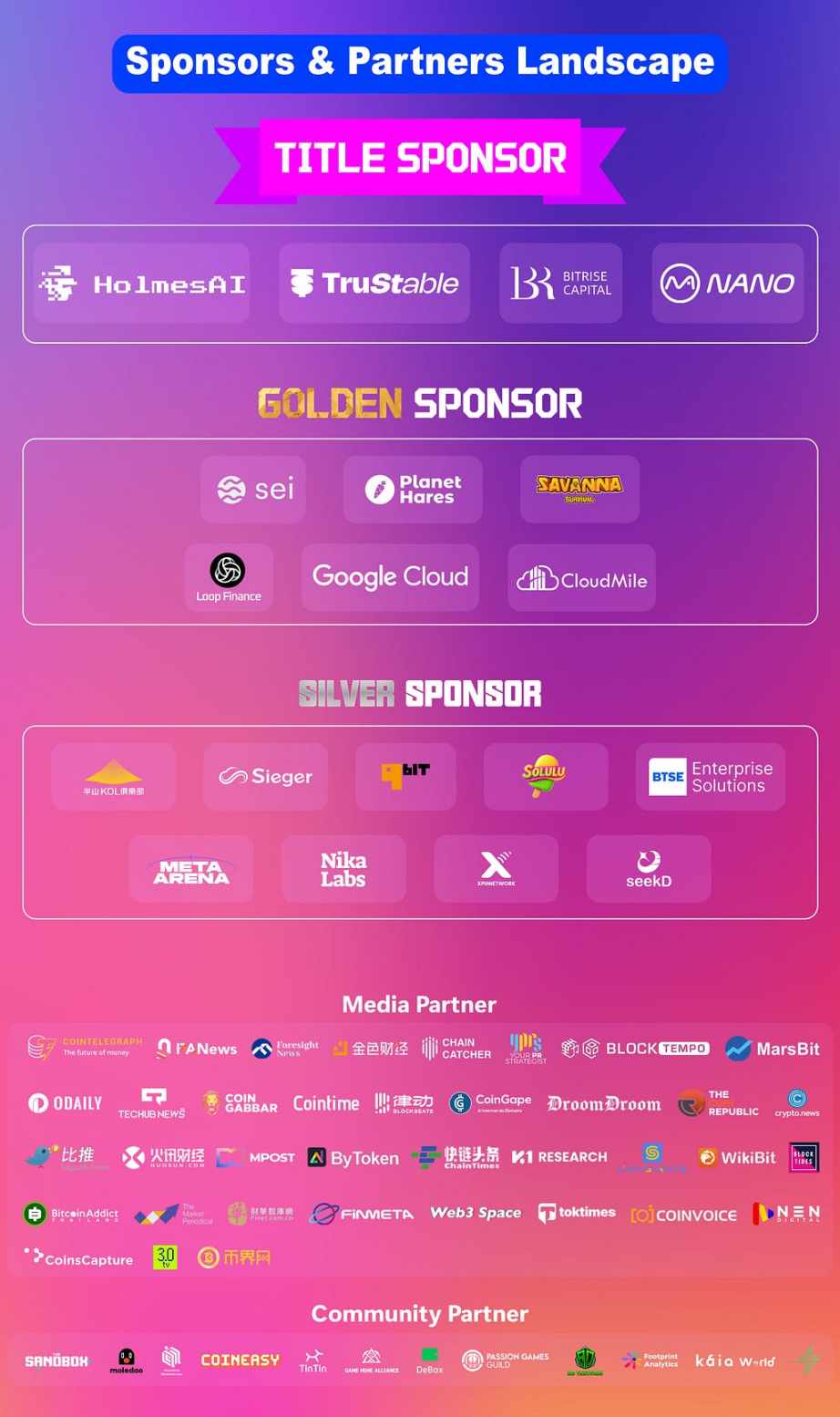 Since its official announcement, the conference has garnered wide attention across the industry and received strong support from numerous partners. HolmesAI, TruStable, Bitrise Capital, and Nano Labs serve as the Title Sponsors, while Sei, Planet Hares, SavannaSurvival, Loop Finance, Google Cloud, and CloudMile are the Golden Sponsors. The Silver Sponsors include BS KOL Club, Sieger, The9bit, SOLULU, BTSE Enterprise Solutions, MetaArena, Nika Labs, XPIN Network, and SeekD. The participation of multiple media partners and ecosystem partners has also provided solid backing for the successful hosting of the event.