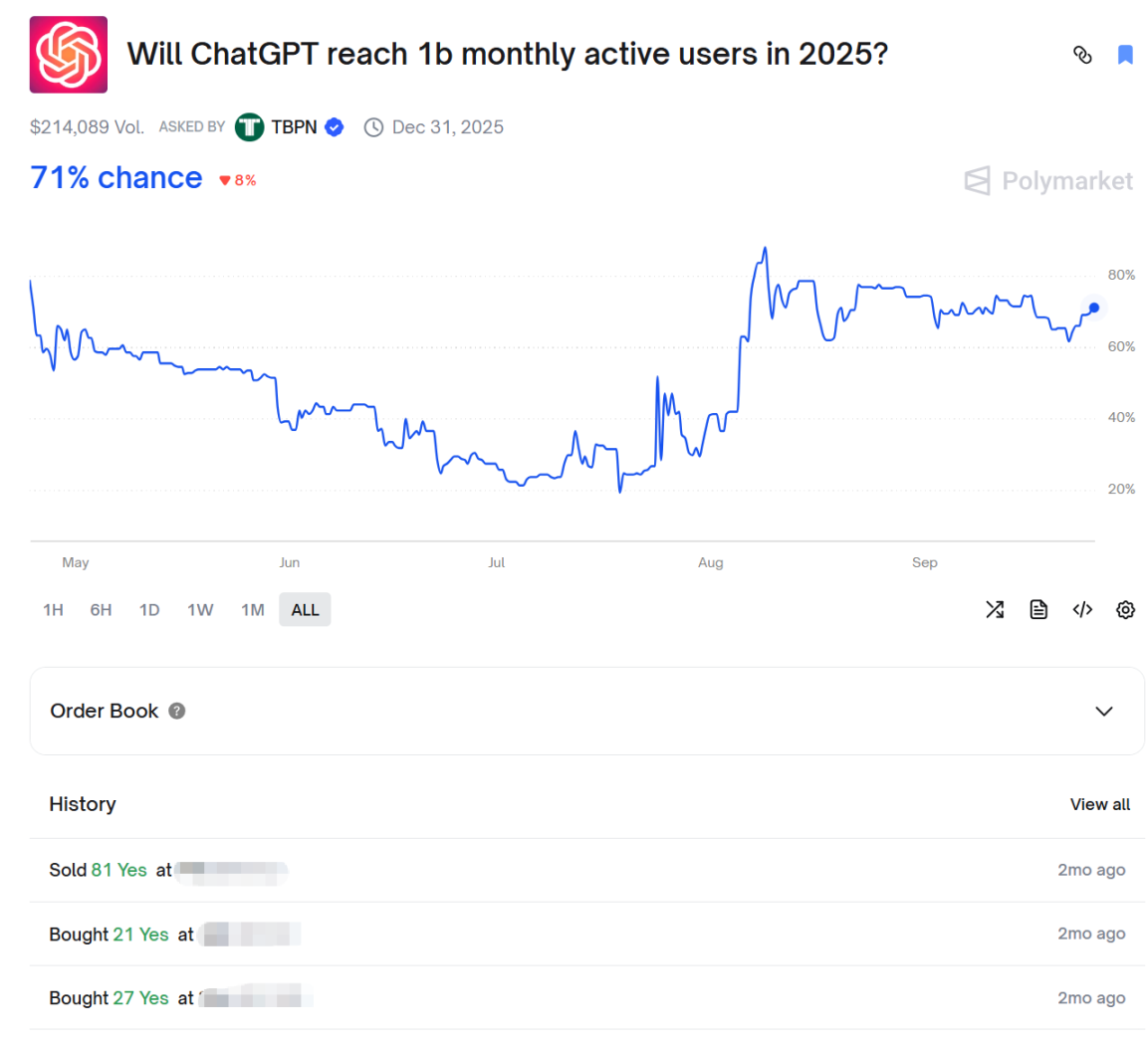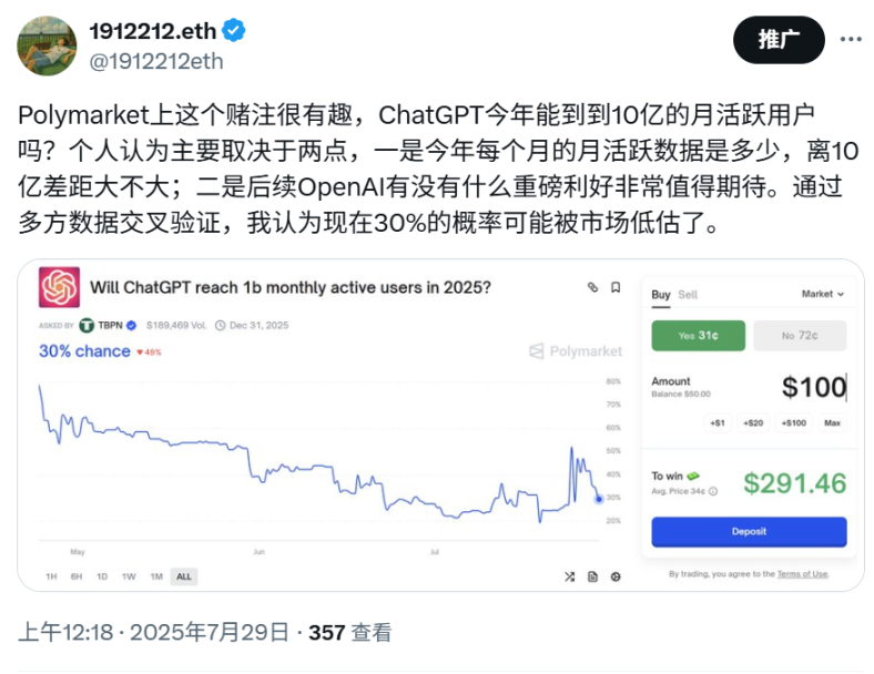 小编个人比较关注 Polymarket 上的三四个熟悉的垂直领域,包括 Crypto、科技、川普以及美联储降息,其中部分下注机会需每日进行扫描。举例而言,小编在 7 月 29 日发现,科技频道中发现非常有趣的赌注市场:ChatGPT 会在 2025 年月活达到 10 亿吗?