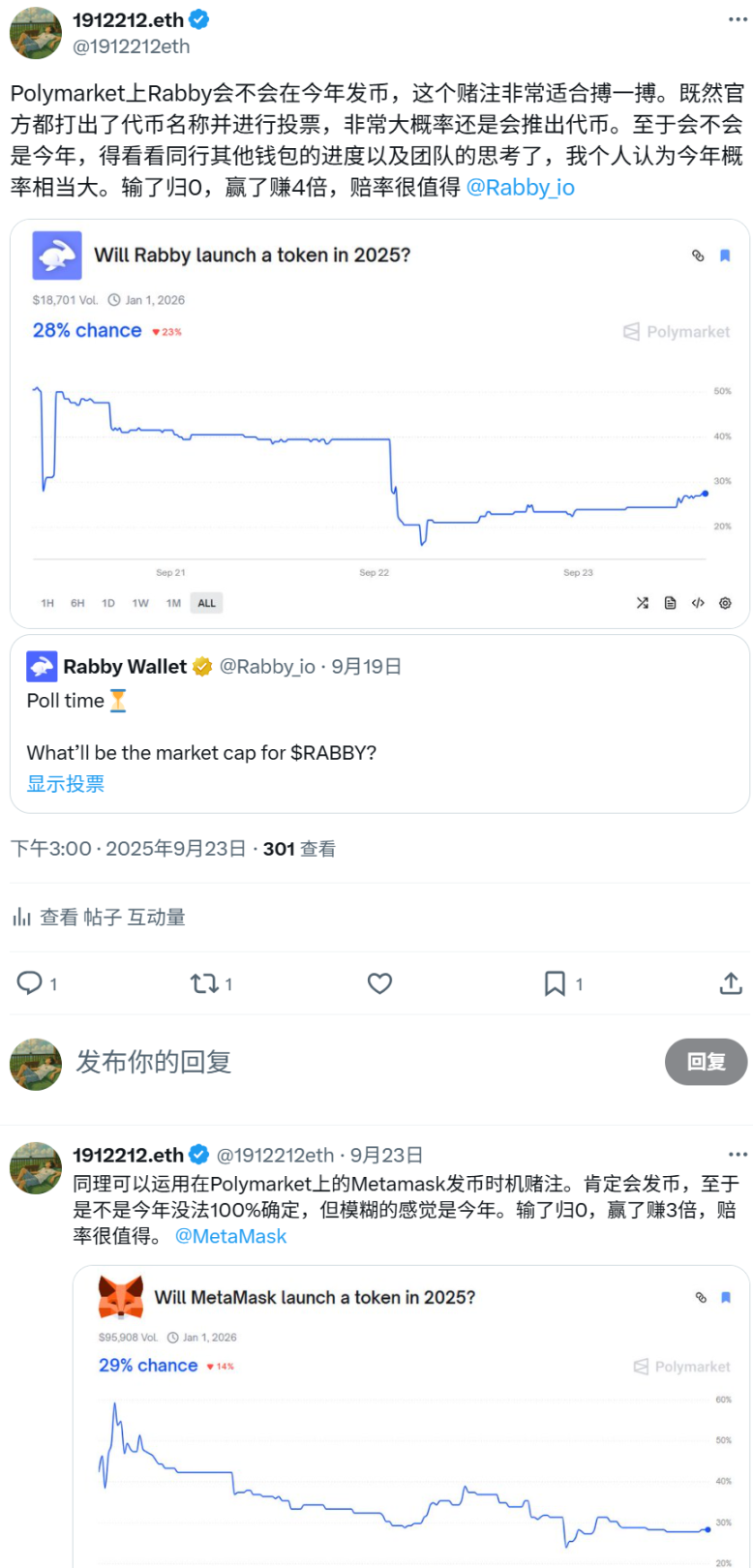 9 月 23 日,小编在扫描 Polymarket 上的加密预测市场时,偶然发现竟然有 Rabby 以及小狐狸 MetaMask 的发币时间预测。