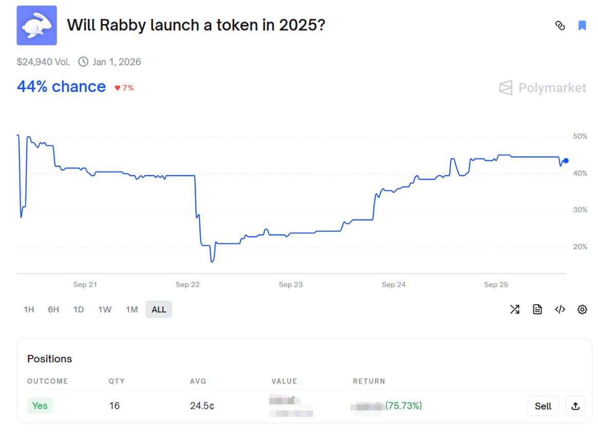 9 月 24 日,市场押注 Rabby 今年发币概率一度飙升至 44%。