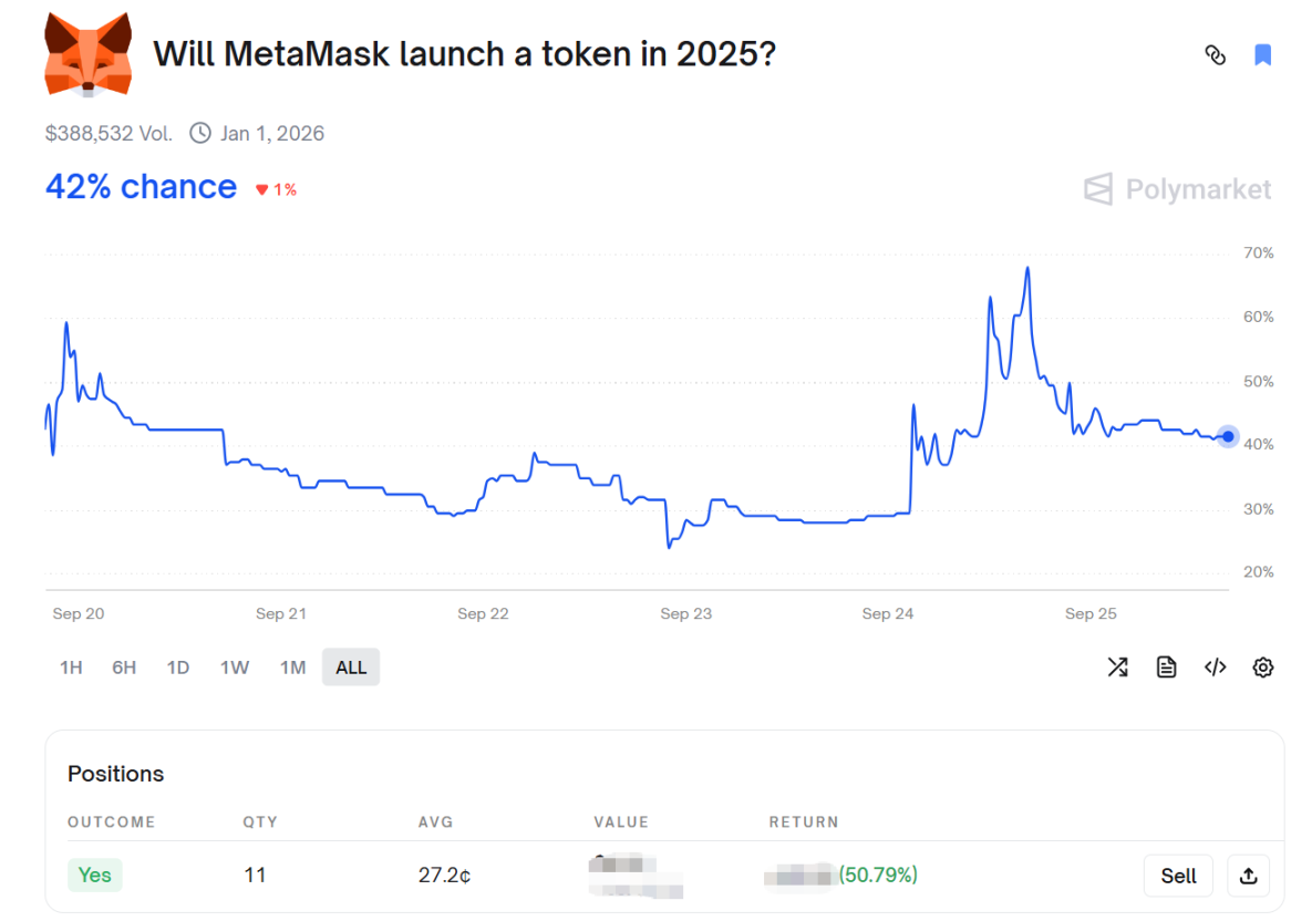 市场押注 MetaMask 今年发币的概率,甚至一度飙升至 68%。