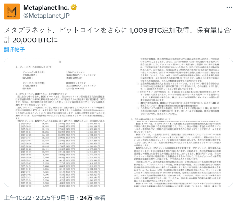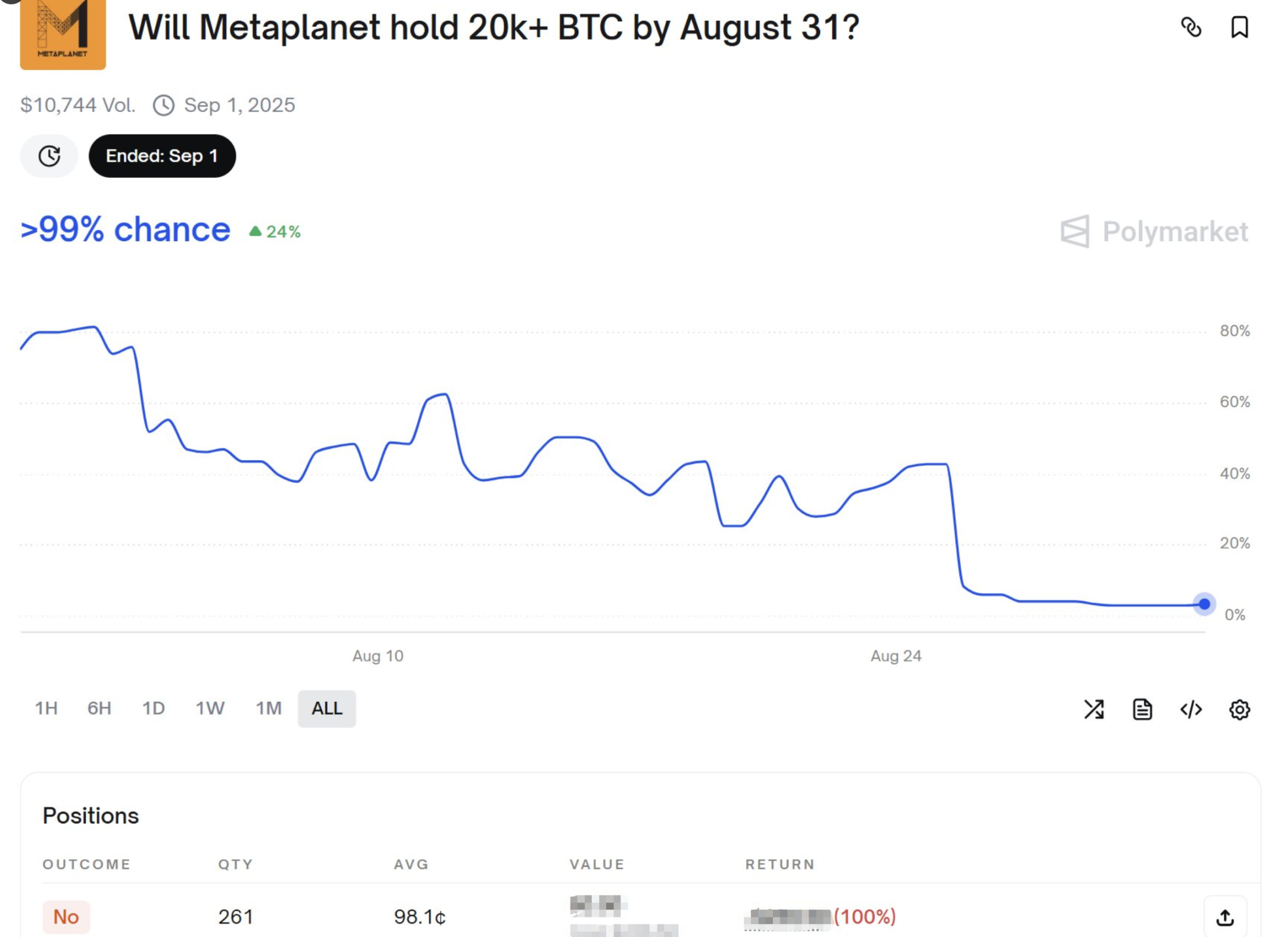 8 月 30 日晚间,小编注意到一个赌注:日本上市公司 Metaplanet 时是否会在 8 月 31 日 11:59 PM ET(美国东部时间)持有 2 万枚 BTC。当时市场押注概率 NO 的概率已飙升至 98%。要知道在 8 月 25 日时,其宣布加仓了 103 枚 BTC,总持有量为 18991 枚 BTC,距离 2 万枚仍有超 1000 多枚。