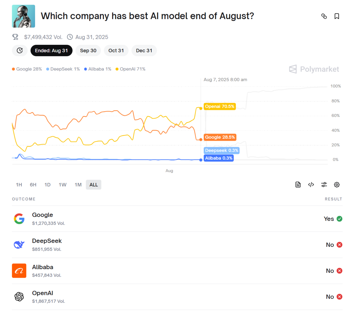 小编在 8 月初发现有关「9 月 1 日前最牛 AI 模型的押注」。当时谷歌领先,而 OpenAI 则远远落后,小编发现随着 ChatGPT5 的推出,OpenAI 肯定有机会。
