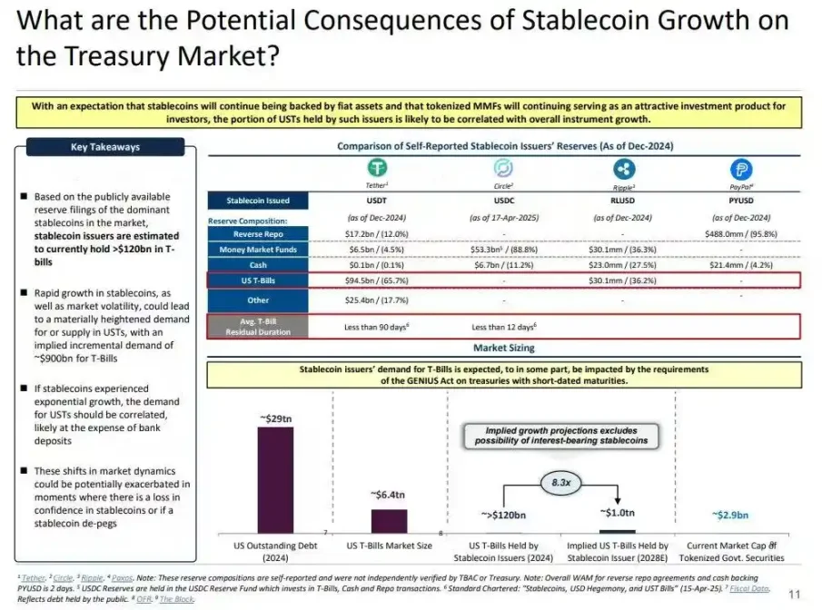 稳定币发行方是短期美国国债的长期净买家。每一美元的稳定币发行,资产负债表上都必须有等值的资产支持——通常是国库券或逆回购头寸。但与传统银行不同,稳定币发行方不会出售这些国债用于放贷或转向风险资产。