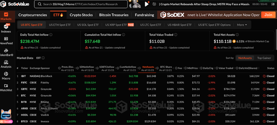 According to statistics, from November 17 to November 21, US Bitcoin spot ETFs recorded a net outflow of $1.217 billion. As of November 21: