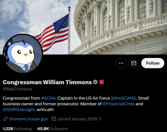 在最近一年里,Pudgy Penguins 这个来自 Web3 世界的 IP 展现了罕见的跨墙能力,成为行业少见的现实级样本。最近,美国国会议员 William Timmons 主动将社交媒体头像换成 Pudgy Penguin 形象,迅速引发全球用户的关注和讨论。这不是简单的名人效应,而是文化认同层面的突破——一个政治人物愿意用 Web3 符号代表自己的公众形象,标志着这个 IP 已经跨越了"加密货币小圈子",开始被主流社会接纳。