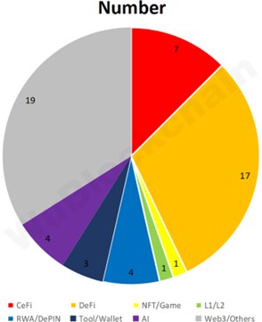 其中,CeFi 占比约 12.5%,DeFi 占比约 30.4%,NFT/GameFi 占比约 1.8%,L1/L2 占比约 1.8%,RWA/DePIN 占比约 7.1%,Tool/Wallet 占比约 5.4%,AI 占比约 7.1%。