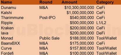 2025 年 11 月总融资金额为 145.4 亿美元,其中对 Upbit 的收购即占据了 103 亿,环比上升 219%(2025 年 10 月共 45.56 亿美元),同比上升 3131%(2024 年 11 月共 4.5 亿美元)。其中,金额排名前 10 的轮次如下: