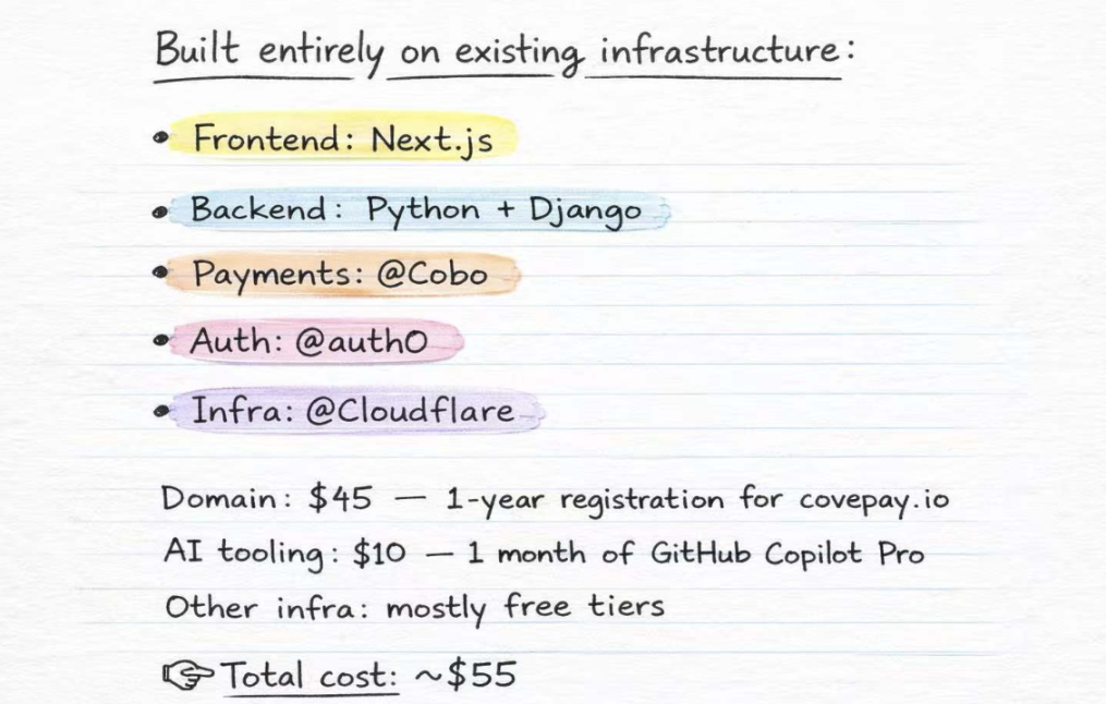 而 angryrody 也明确表示,在实现层面,整个系统几乎完全依赖成熟的现成组件:前端使用 Next.js,后端采用 Python 与 Django,支付由 Cobo payment 提供,身份认证来自 Auth0,基础设施托管在 Cloudflare 之上。整个过程中,并未引入任何尚未被广泛使用的新技术。
