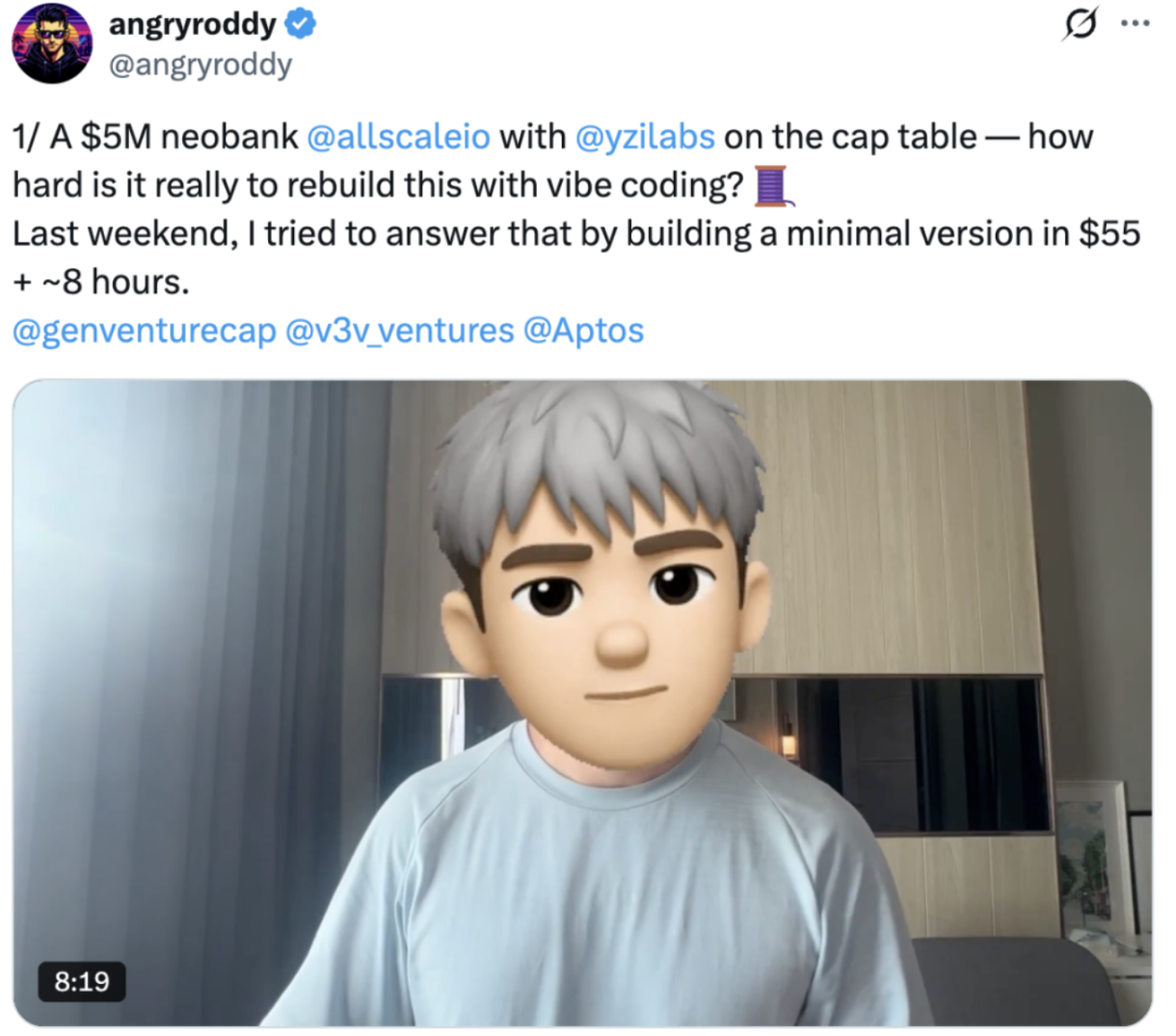 一个颇具象征意味的细节是,近期有第三方开发者通过 vibe coding 的方式,在大约 8 小时 内、以 约 55 美元的成本,复刻出了 AllScale 的最小可用形态(MVP)。这个案例在某种程度上与 Shawn Pang 的叙事形成了微妙的呼应:One-Person Unicorn 不仅正在成为被服务的对象,也开始成为金融产品被构建的方式本身。