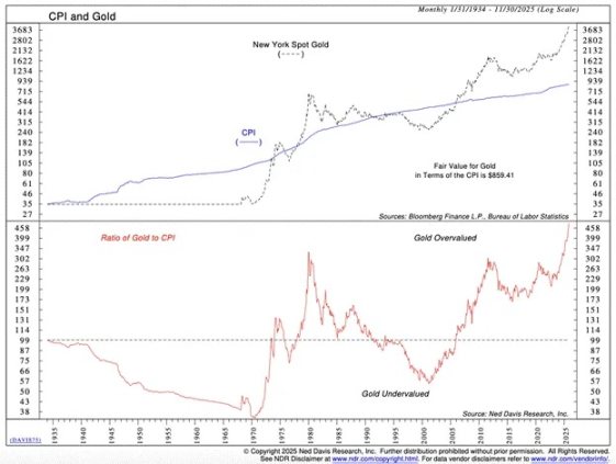 在法定货币体系中,传统观点认为黄金是「抗通胀工具」,因此其价格应大致与各国官方公布的消费者价格指数(CPI)通胀数据同步。上图显示,自 20 世纪 30 年代以来,黄金价格基本与通胀指数保持同步。但 2008 年之后,尤其是 2022 年之后,黄金价格增速大幅超过通胀增速。难道黄金正处于泡沫之中,会让我这样的投资者遭受惨重损失吗?