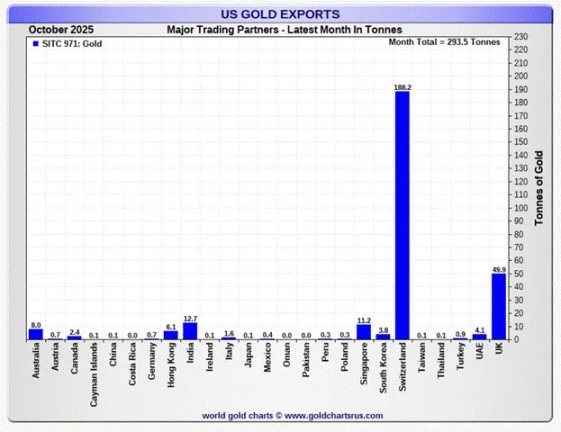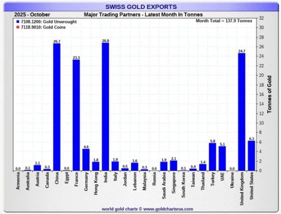 黄金的流向是这样的:美国将黄金出口至瑞士,瑞士对黄金进行精炼并铸成不同规格的金锭,再运往其他国家。下图显示,买入这些黄金的主要是中国、印度及其他新兴经济体 —— 这些国家要么擅长生产实体商品,要么是大宗商品出口国。这些国家生产的商品最终流入美国,而黄金则流向了全球更具「生产力」的地区。这里的「生产力」并非指这些地区的人更擅长填写繁琐的报告,或是在电子邮件签名中标注正确的性别代词,而是指它们能出口能源及其他关键工业大宗商品,普通民众能生产钢铁、精炼稀土等实体产品。在美元流动性下降的背景下,黄金价格之所以能上涨,正是因为各国正加速推动全球金本位的回归。