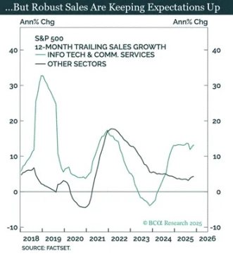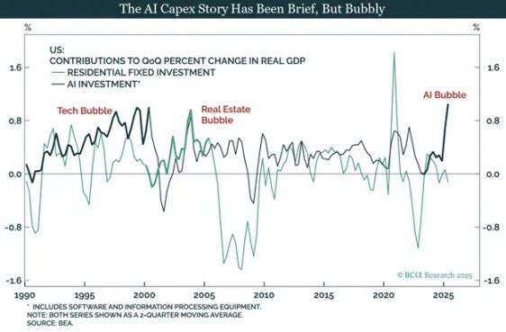 无论是否存在泡沫,为「赢得 AI 竞争」而增加支出,正推动美国经济增长。特朗普在竞选时承诺要推动经济「火热运行」,因此,即便未来几年回顾时会发现,这些支出的股本回报率低于资金成本,他现在也不会停下脚步。