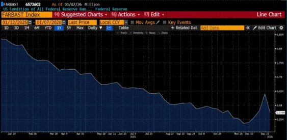 如上图所示,2025 年,由于量化紧缩(QT)政策 [4],美联储资产负债表规模持续收缩。2025 年 12 月,QT 政策结束,美联储在当月的会议上推出了最新的「印钞计划」——「储备管理购买(RMP)」。我在《爱的语言(Love Language)》一文中,已详细解读过 RMP 的运作机制。图表清晰显示,美联储资产负债表规模在 2025 年 12 月触底。根据 RMP 计划,美联储每月至少向市场注入 400 亿美元流动性;且随着美国政府融资需求增加,这一购买规模还将扩大。