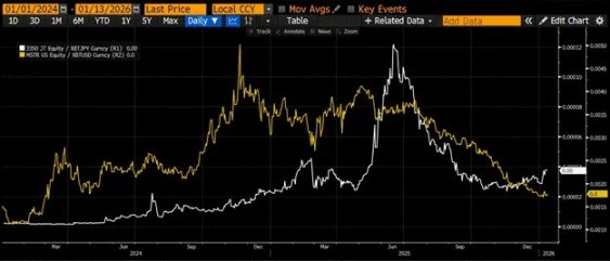 我将 Metaplanet 的股价(白色曲线)除以日元计价的比特币价格,将 Strategy 的股价(金色曲线)除以美元计价的比特币价格。结果显示,这两只股票的「比特币比价」处于过去两年的低位,且较 2025 年中期的峰值已大幅下跌。若比特币价格能回升至 11 万美元,投资者将重新倾向于通过这些股票间接布局比特币。由于这些公司的资本结构中天然蕴含杠杆属性,在比特币上涨阶段,其股价涨幅将超过比特币本身。
