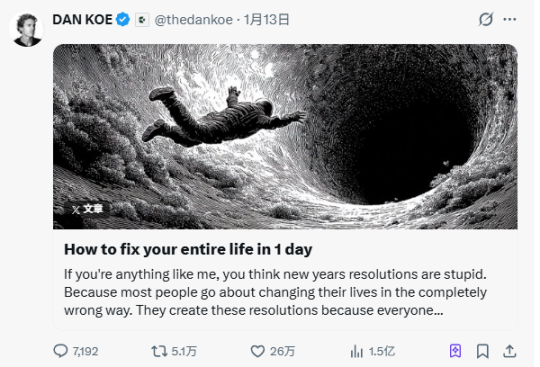 还有一个解释是运气。Dan Koe 撞上了 X 调算法的窗口,新年情绪周期,以及马斯克想推长文的政策风口。三件事叠在一起,1.5 亿就出来了。