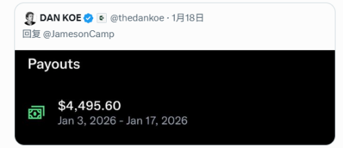有人好奇这能赚多少钱。Dan Koe 晒了收益截图,14 天,X 平台给他分了 4495 美元。