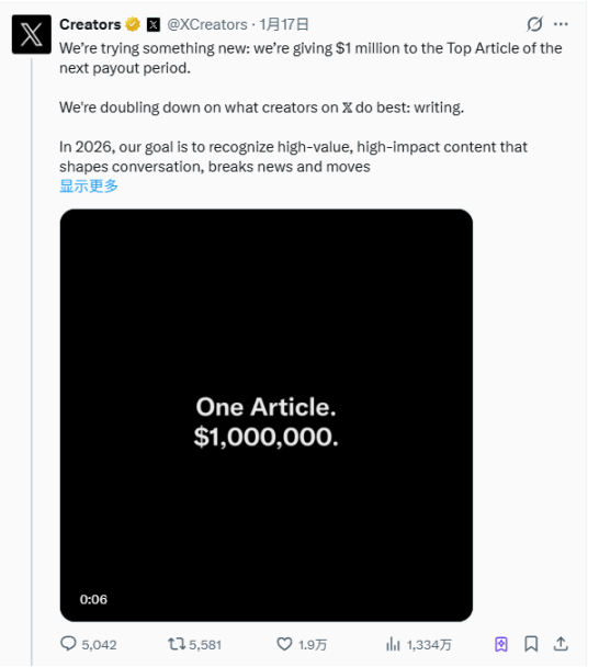 1 月 16 日,Dan Koe 那篇文章爆火几天后,X 宣布了新政策:创作者收益池翻倍,长文章权重提升,额外拿出 100 万美元奖励表现最好的原创文章。