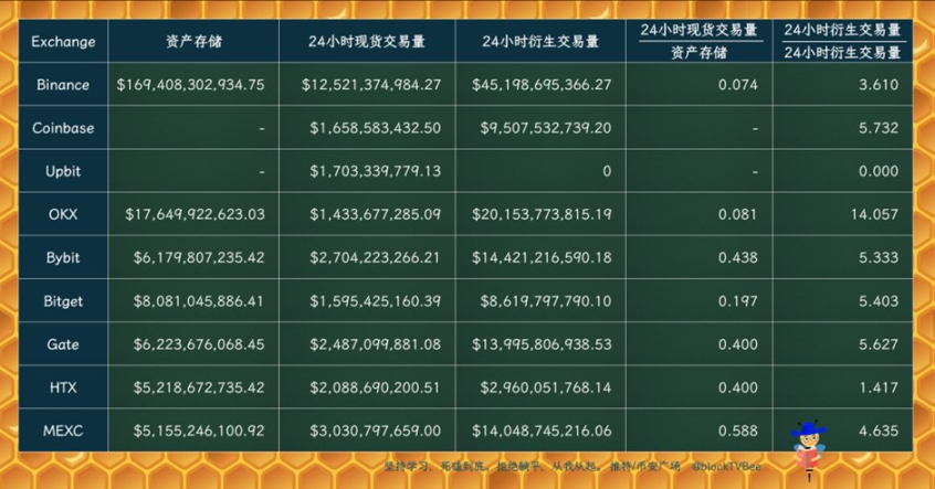 使用 24 小时现货交易量除以资产存储,币安是比例最小的。这是因为币安中有不少用户使用币安作为资产存储、甚至支付工具,而不仅仅是交易场所。