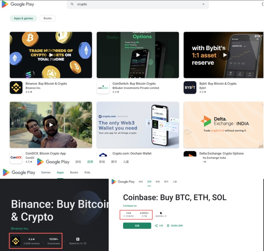 在 Google Play,币安 APP 是下载量最高的加密应用,全球下载量 1 亿 +,评分 4.6 分。