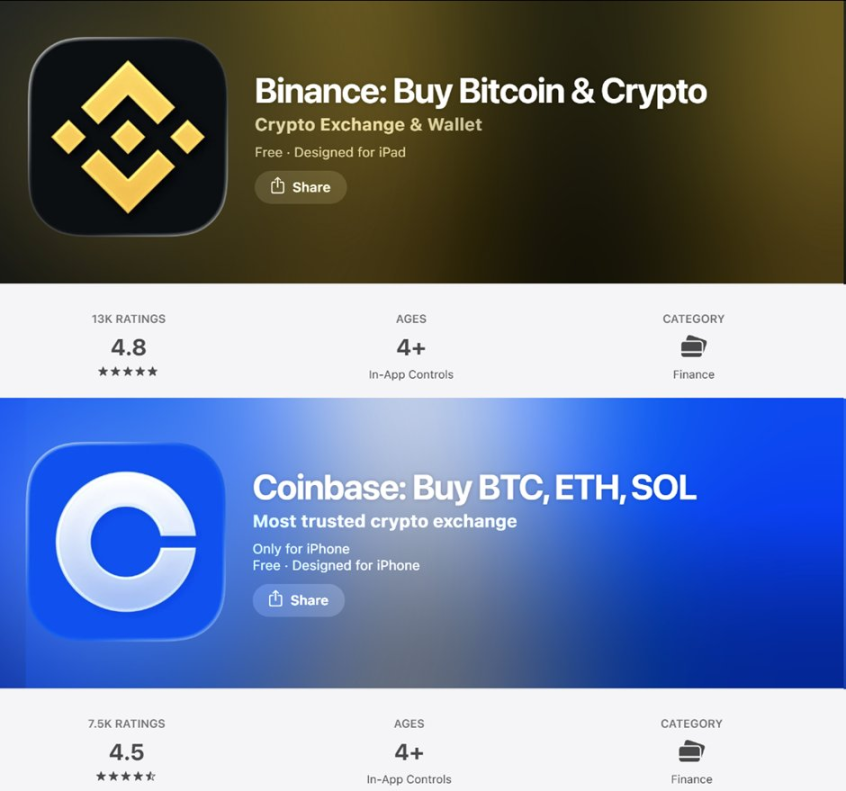 在苹果 App Store,币安 13000 个评价给出 4.8 分的好评,Coinbase7500 个评价综合得分 4.5 分。