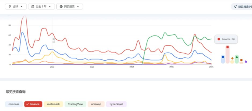 包括头部 CEX、DEX、钱包甚至综合分析平台在内,币安都是搜索量最高的平台。