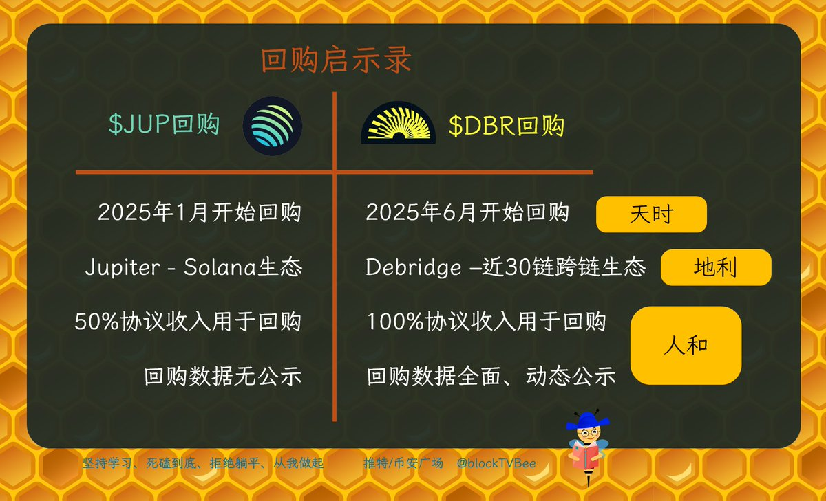 Jupiter 使用协议收入的 50% 回购 JUP, 而 Debridge 使用协议收入的 100% 回购 DBR。