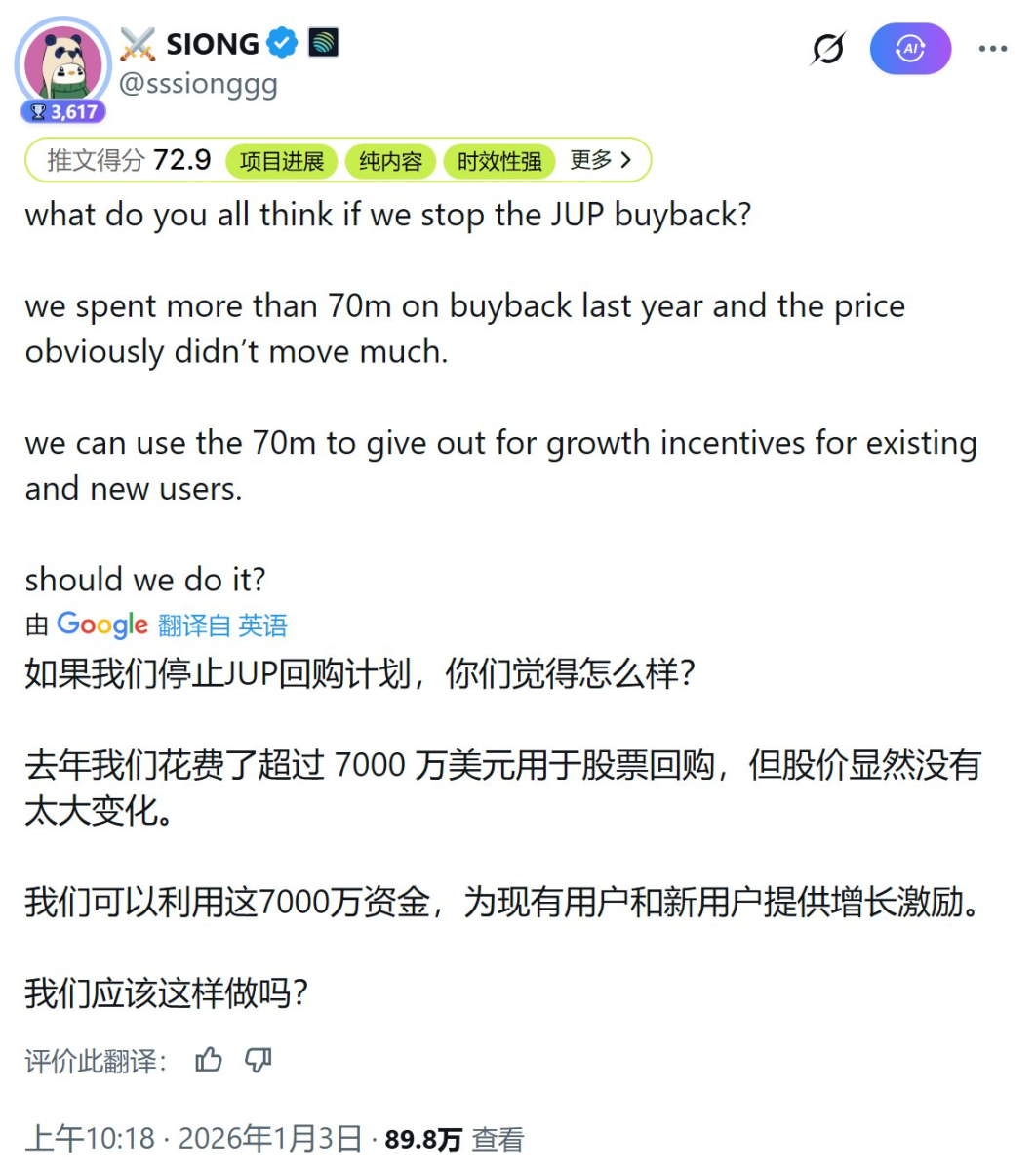 1 月初,JUP 联创一条推文,引发了市场对代币回购的讨论。
