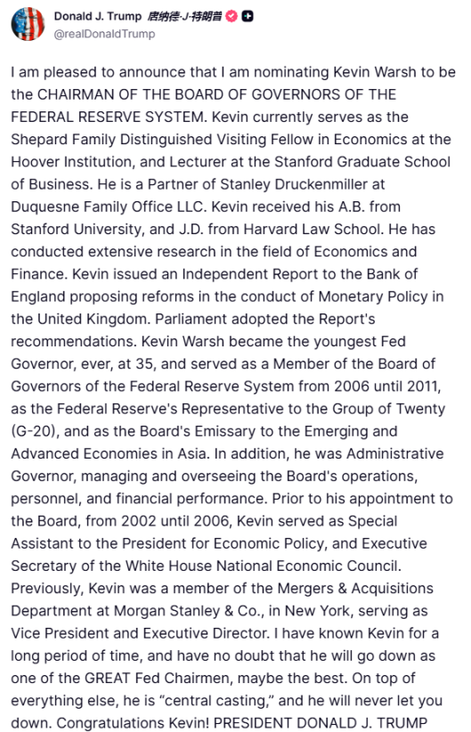 《特朗普提名凯文·沃什担任美联储主席,他是币圈盟友还是终极 BOSS?》