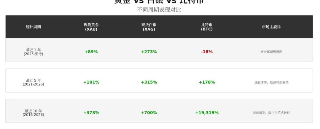 如果从长期视角看,比特币依然是回报最高的资产之一。但放到过去一年,比特币的表现却明显落后于黄金和白银。2025 年至 2026 年初的市场走势呈现出极为鲜明的二元分化特征,贵金属市场步入了一个被称为「超级周期」的阶段,而比特币略显颓势。下面是三个关键周期的对比数据:
