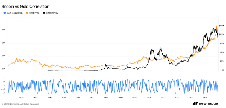 第一,比特币与黄金的联动,从一开始就不是避险共振。 比特币早期还处于极客圈子的起步阶段,当时市值和关注度都微乎其微。2013 年塞浦路斯爆发银行业危机,部分资本管制措施实施,黄金价格却从高位大幅回落约 15%;同期比特币飙升至超过 1000 美元。这被一些人解读为资本外逃和避险资金涌入比特币,然而事后来看,2013 年的比特币疯涨更多是由投机和早期情绪驱动,其避险属性并未得到广泛认同。当年黄金大跌、比特币大涨,两者相关性也很低——月度收益率相关性仅 0.08,几乎为零。