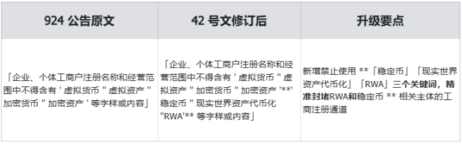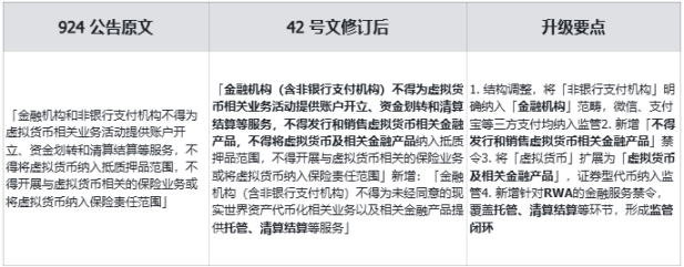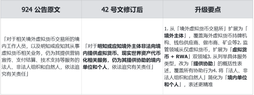 924 公告规定:「任何法人、非法人组织和自然人投资虚拟货币及相关衍生品,违背公序良俗的,相关民事法律行为无效」;42 号文修订为:「任何单位和个人投资虚拟货币、现实世界资产代币及相关金融产品,违背公序良俗的,相关民事法律行为无效」,将投资标的从「虚拟货币及相关衍生品」扩展为「虚拟货币、现实世界资产代币及相关金融产品」,监管覆盖更全面。