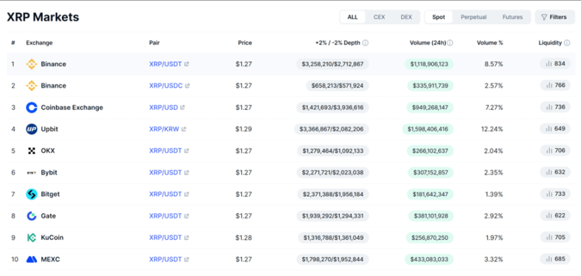 XRP 在币安的交易量和交易深度相对一般,但是 XRP 在 Coinbase 和 Upbit 市场更加活跃。尤其是 Upbit,最近 24 小时 XRP 交易深度和交易量大约是币安的 10 倍。