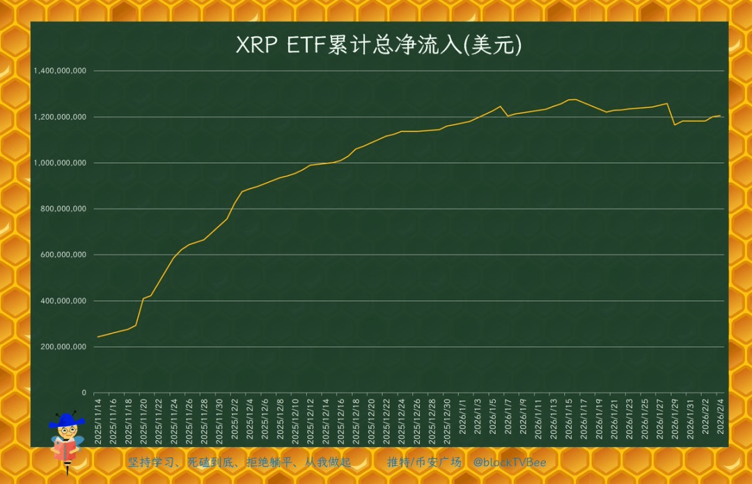并且 XRP ETF 总资金净流入仅次于 BTC 和 ETH,超过 SOL。截至 2 月 5 日,美国 XRP ETF 净流入资金 12.1 亿美元。11 月 14 日上市交易以来,即使行情持续下跌,XRP ETF 总体仍然保持资金流入,仅 4 天资金净流出,其余时间均为净流入。