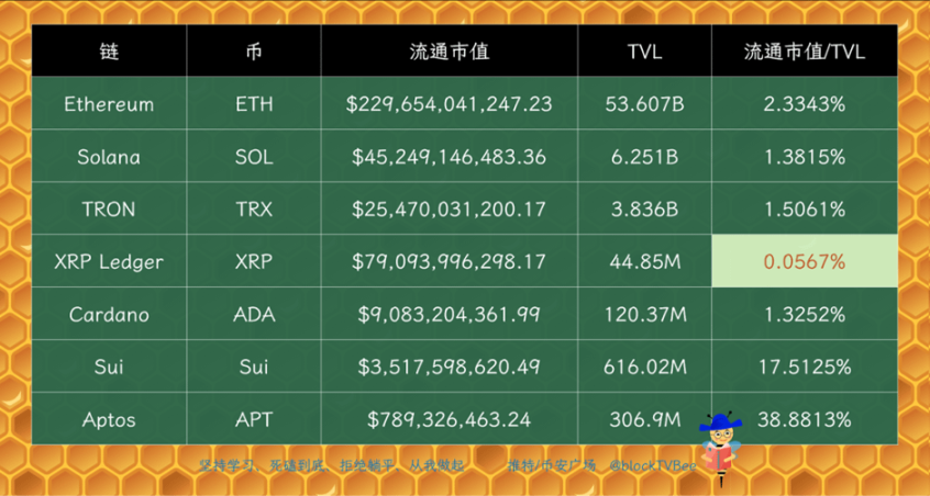 即使不与以太坊、BSC 这类 EVM 兼容链相比,也不和 MEME 生态繁荣的 Solana 链相比,仅和 Cardano(ADA 相比 ),XRP Ledger 生态的 TVL 占比也是很低的。