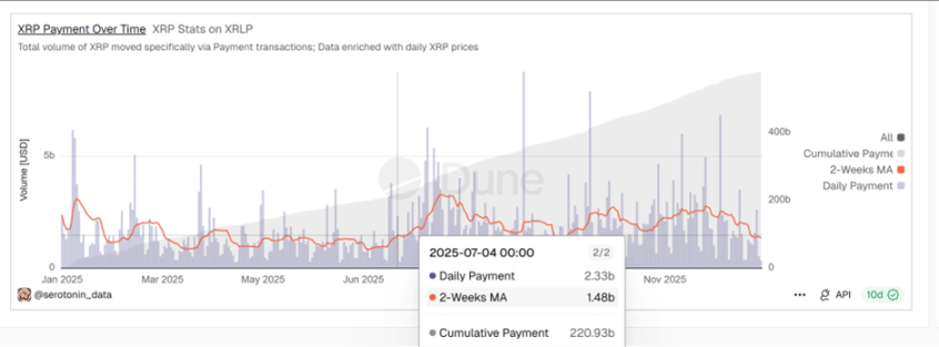 Dune 数据显示,2025 年平均每天的 XRP 支付大约 15 亿美元左右。2025 年全年支付大约 6000 亿美元。