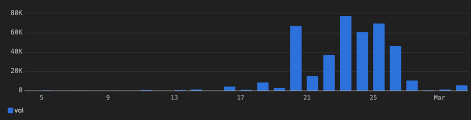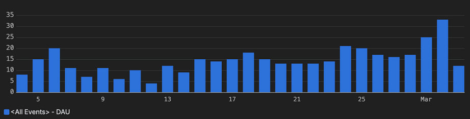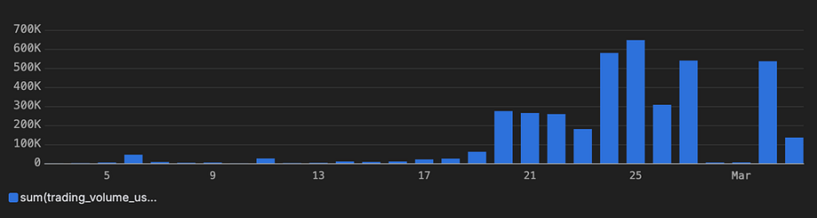 On platform, weekly volume reached ~$2.3M — up ~+151% from last week — reflecting strong directional conviction from traders positioning around SUI's downside. SUI dominated activity at ~63% of volume, almost entirely on the short side. ETH followed as the second most active market, with long-biased flow. WAL and HYPE also saw notable activity, both skewed heavily short. Active user counts continued to grow steadily through the week, with the trend accelerating into the weekend.
