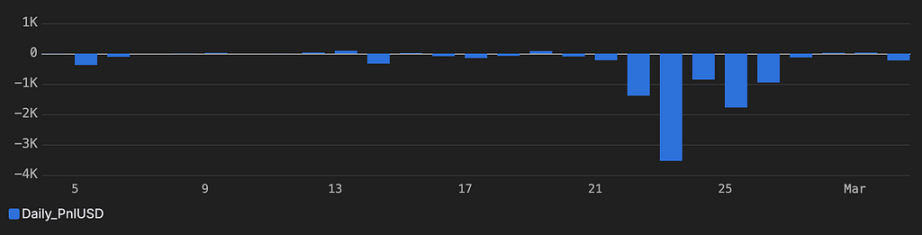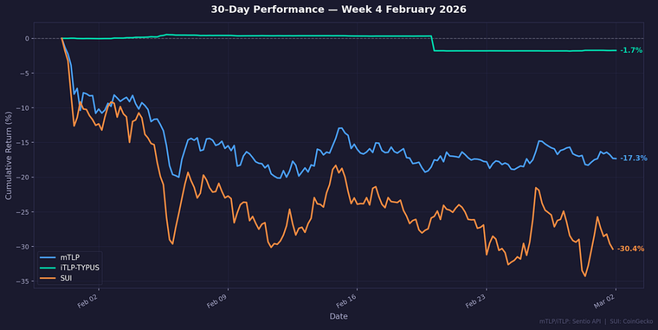Across the four weeks since relaunch, both TLP products have navigated a challenging market environment. mTLP accumulated a -7.96% return over the period, while iTLP-TYPUS returned -1.70%. SUI, by comparison, declined ~-20% over the same stretch. The gap between mTLP and SUI illustrates the buffer effect of fee income and counterparty gains — even in a sustained downturn, LP participation meaningfully reduced the impact of underlying asset declines.