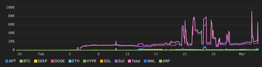 Total liquidations reached ~$265k — nearly double the prior week's ~$135k and the largest single-week figure since relaunch. The majority occurred in the first three days of the week (~$207k, or ~78% of the weekly total), concentrated around the Monday open when SUI's decline was sharpest. By Friday, conditions had stabilized and weekend sessions saw only minimal liquidation activity.